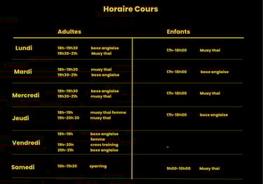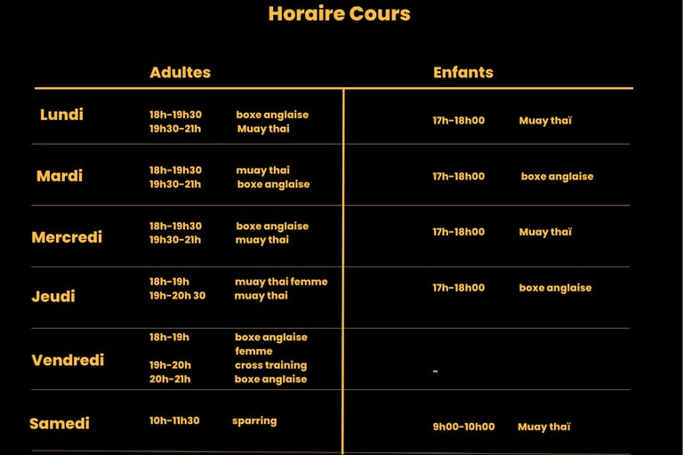 Retrouvez ici tous les créneaux pour nos cours de boxe anglaise, boxe anglaise féminine, boxe anglaise enfant, boxe Thaïlandaise, kick-boxing et renforcement musculaire.